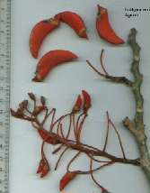 A floração vermelha aparece pouco no meio da folhagem, e não ocorre todo o ano. Fruto vagem mais grossa e curta, com sementes redondas e arroxeadas. Ver mais informações clicando na foto ou em: http://www.esalq.usp.br/trilhas/uteis/ut02.php https://www.aplantadavez.com.br/2015/08/mulungu-da-caatinga-erythrina-velutina.html |