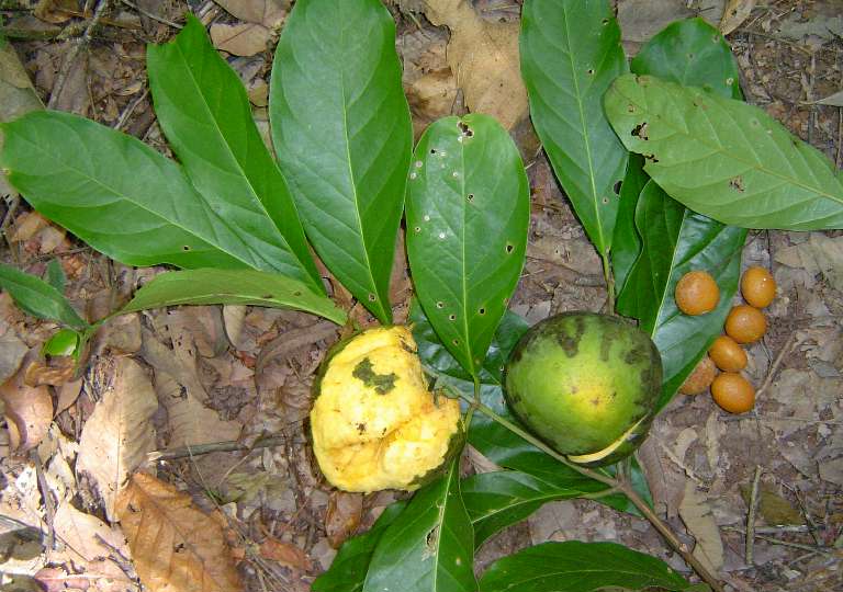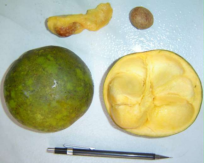 | Características: Não se trata de árvore, e sim de cipó. Fruto com diâmetro 10 cm, casca lisa verde amarelada. Seis a dez sementes de diâmetro 2 cm, cor marrom. Sementes envoltas em polpa fibrosa e macia, amarelo claro, consistência como de Jaca, de cheiro agradável, lembrando manga ou maracujá. Sabor ácido, com retrogosto amargo. Sementes esféricas e muito duras. Quando o fruto caído se decompõe. as sementes ficam dispostas como ovos em um ninho. | ||