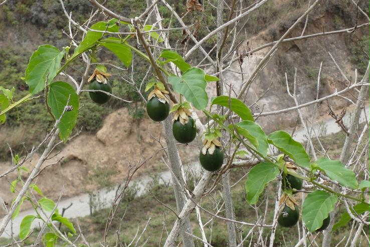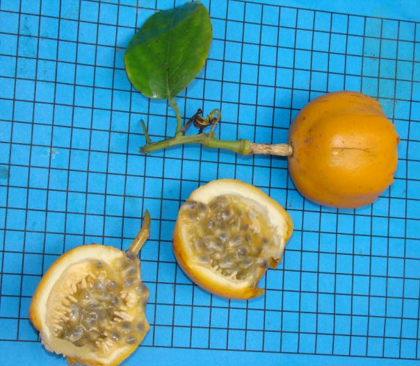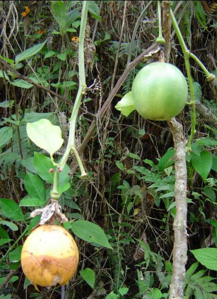 | Características: Não se trata de árvore, e sim de cipó. Ocorre sobre arvores e arbustos, e até de forma rasteira em pastos, sobre o capim. Flor roxa, folhas simples e lisas. Fruto esférico com leves sulcos longitudinais. Quando maduro fica totalmente amarelo. Casca macia e mais espessa. Polpa muito doce. | ||
