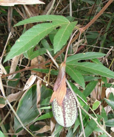 | Características: Não se trata de árvore, e sim de cipó. Ocorre sobre arvores e arbustos. Flor bem vermelha, folhas trilobadas. Fruto com desenho característico, dai o nome. Quando maduro fica verde- amarelado. Casca fina e muito dura. Polpa doce, levemente ácida, com perfume peculiar muito agradável, e diferente de outros maracujás. | ||