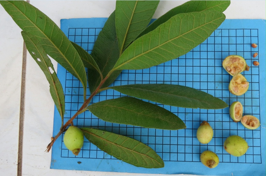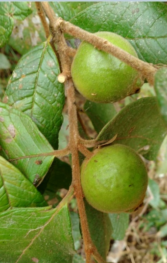 Inicialmente pensamos ser um Psidium apendiculatum, conforme sugestão do Helton, ver link na sua pagina em http://www.colecionandofrutas.com.br/psidiumappendiculatum.htm Entretanto na opinião do Marcos Sobral trata-se de um P. cupreum, que antes era sinônimo de P. rufum, mas hoje foi sugerido a separação. o P. rufum é conhecido como Araçá roxo, mas existem variações. Provisoriamente estou listando com este nome. |