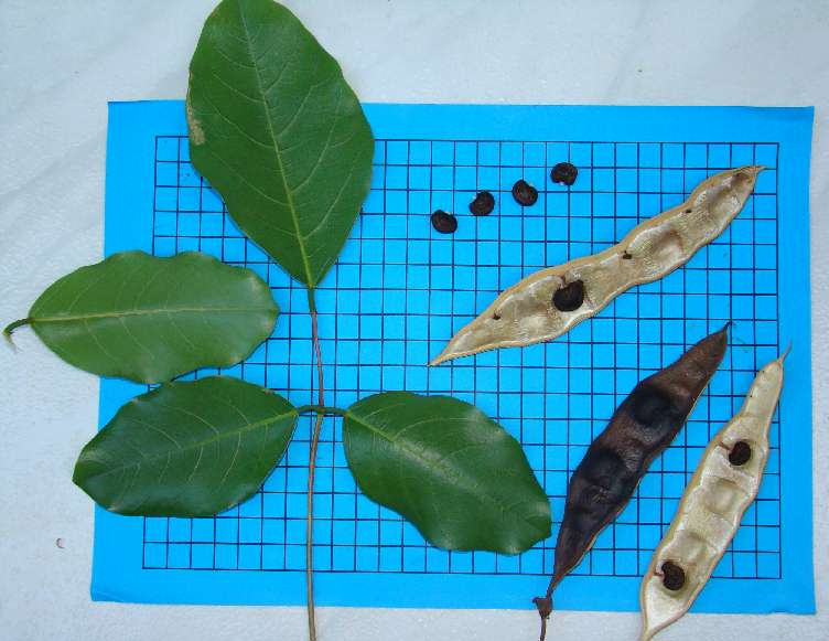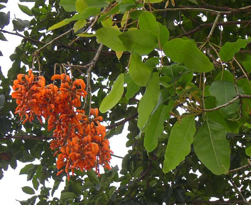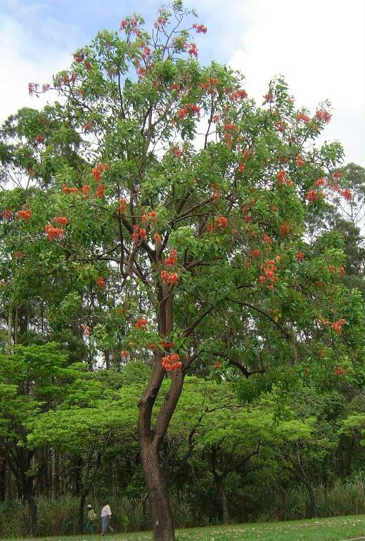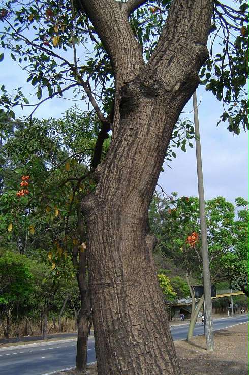 | Características: Árvore de médio porte, 15 a 25 metros de altura, espinhenta, madeira macia, folhas trifoliadas, foliolos lisos de 15 cm, floração vermelho alaranjado em cachos, ocorre com presença de folhas. Fruto vagem de cor preta, 15 a 20 cm, sementes como um feijão arredondado, 1 cm. | ||