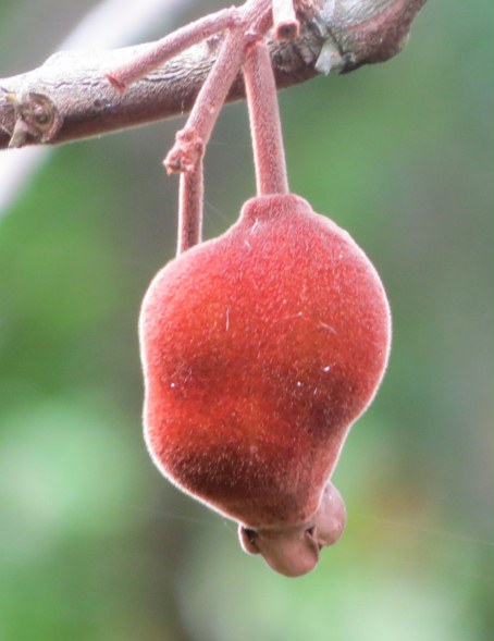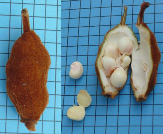 amarelado-avermelhados quando maduros, tomentosos, com umas 7 sementes pretas com um fino arilo branco. Não é