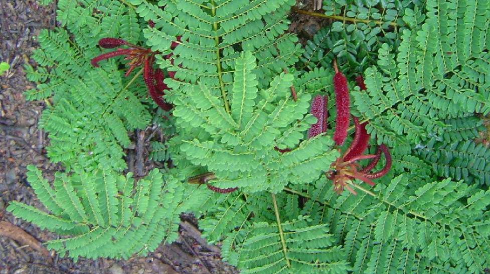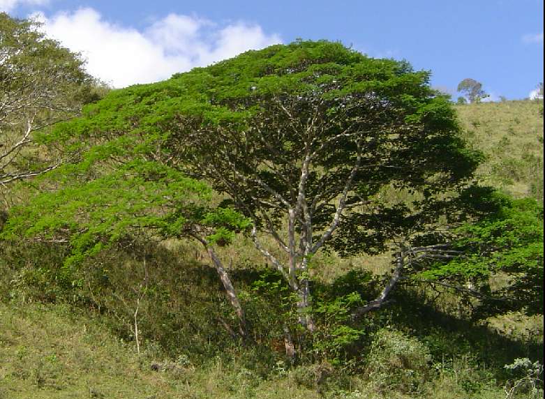 | Características: Árvore médio porte, 6 a 15 metros de altura, Árvore bastante copada, mais baixa e com sombra densa. Folhas pinadas com 14 a 20 pares de folíolos de 3 cm. Flores em cacho em forma de espiga, creme a marrom. Fruto vagem grossa e curta, 8 cm, com superfície marrom tomentosa. Junto com as sementes tem uma seiva. Sementes duras de 0,8 cm. Germinação fácil. | ||