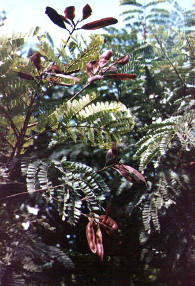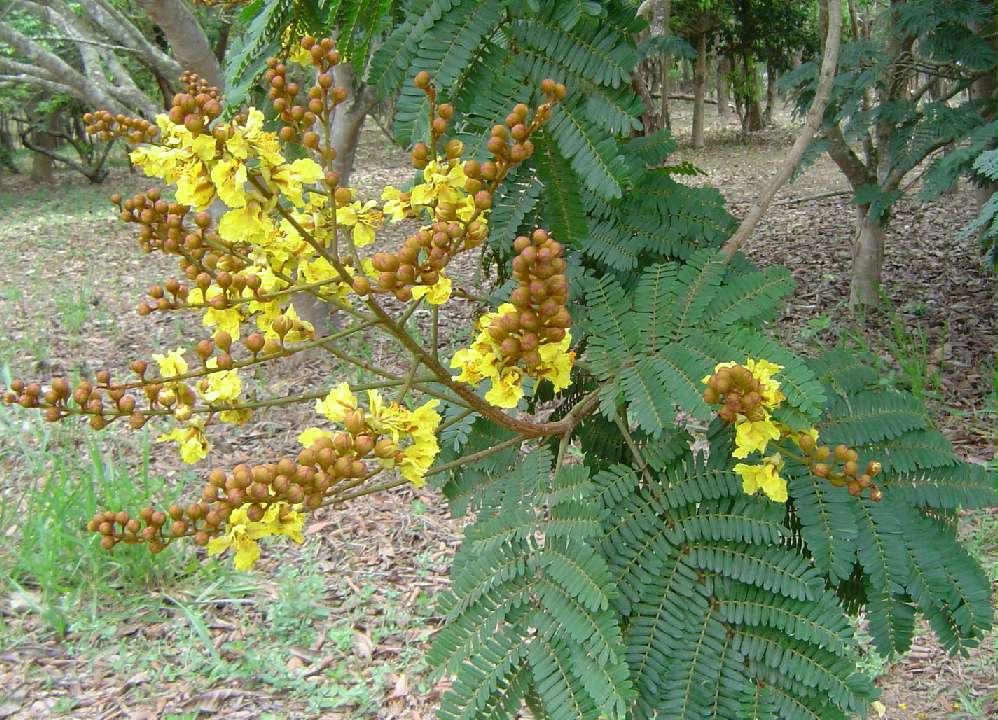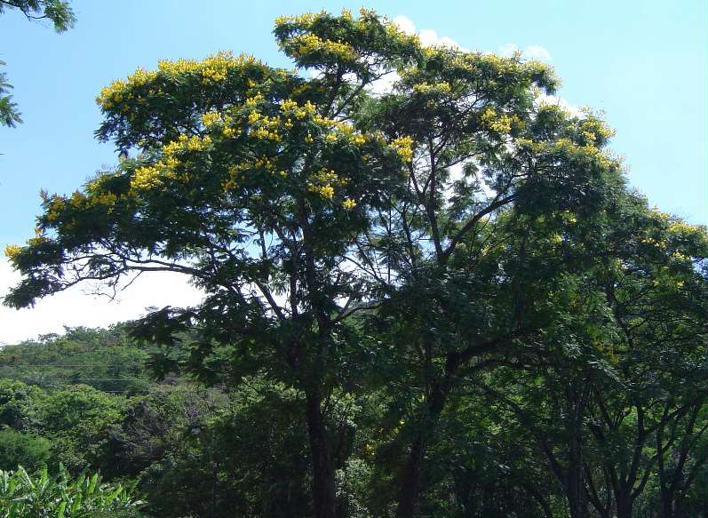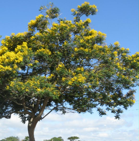 | Características: Árvore de médio a grande porte, 15 a 25 m, em geral bastante copada. Folhas compostas bipinadas, 12 a 20 pares de pinas, 20 a 30 pares de folíolos por pina. Flores em cacho, normalmente voltado para cima, amarela. Fruto vagem achatada de 6 a 8 cm, marrom claro. Uma semente por vagem, 1 cm, cor clara. | ||