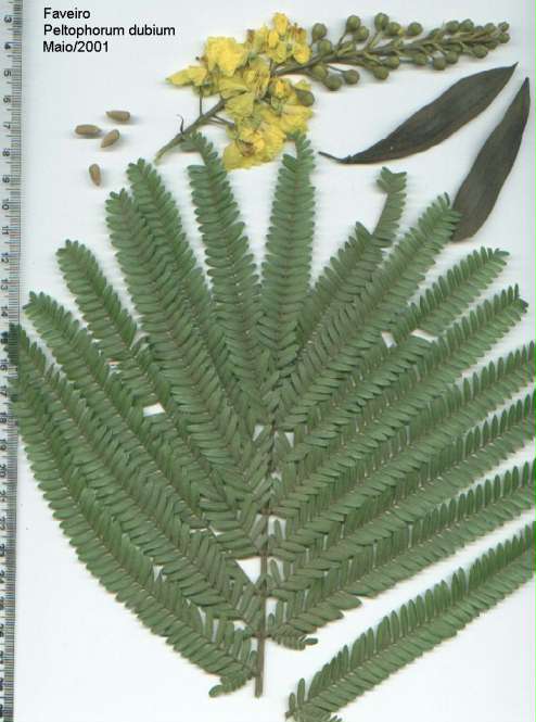 | Nome cientifico: Peltophorum dubium | Família: Fabaceae Caesalpinioidae | Nomes populares: Faveiro, Sobrasil, Canafístula, Farinha seca. |