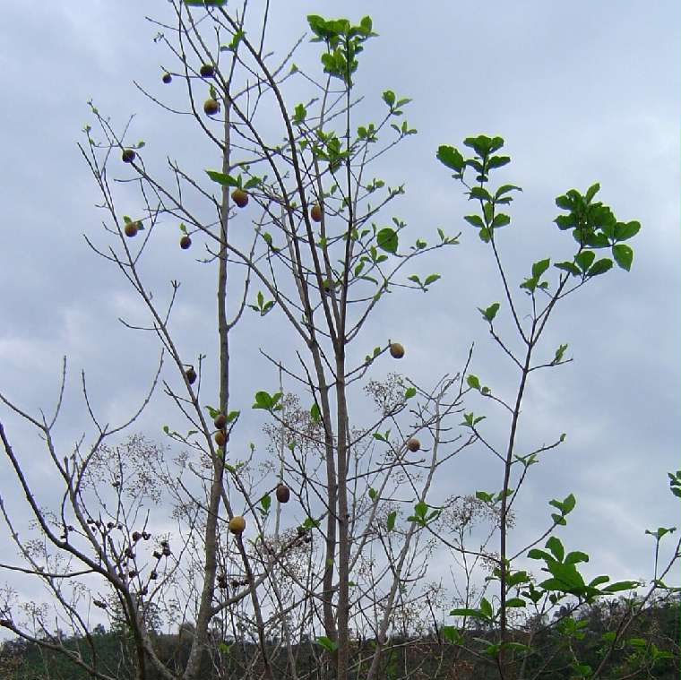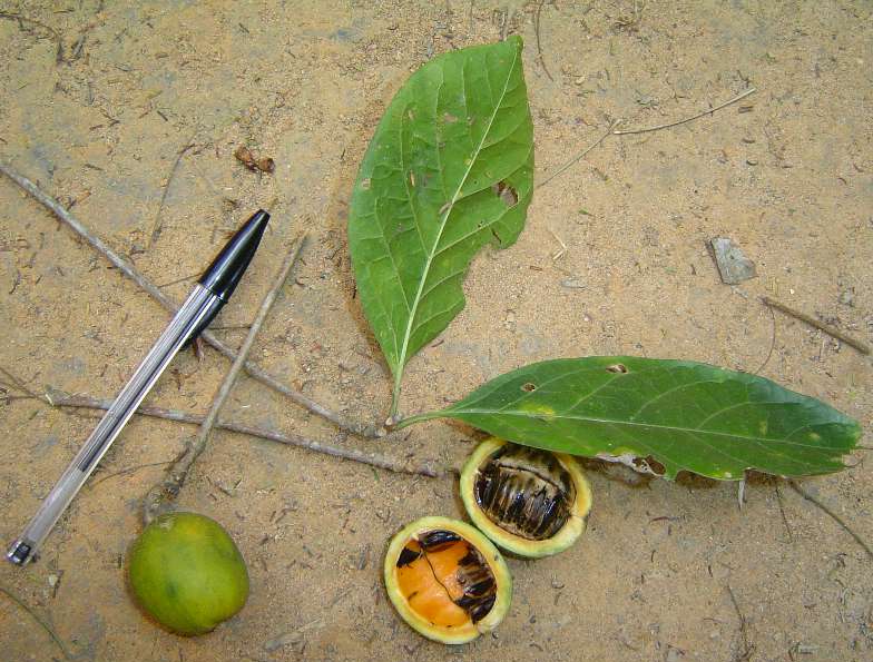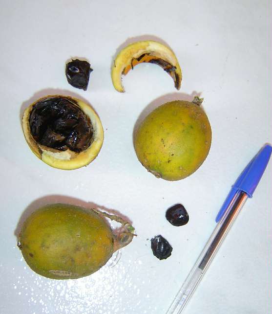 | Características: Árvore de pequeno porte, esguia, eventualmente com espinhos agudos em pares. Folhas simples, 15 cm, nervuras marcadas. Não foi observada com flores, mas pela informação são flores brancas, pequenas. Fruto redondo, liso, 8 cm, duro, amarelado quando maduro. Contem dezenas de sementes redondas e achatadas como um disco, dispostas ordenadamente em colunas, 1 cm, envoltas por uma polpa preta como um óleo, com cheiro adocicado. Germina bem porem tem o desenvolvimento lento. Sabemos que esta é uma Randia (fam Rubiaceae), mas ainda não sabemos qual. O nome Fruta da Marola é uma referência à Lagoa da Marola, um dos locais na região onde ela é encontrada. | ||