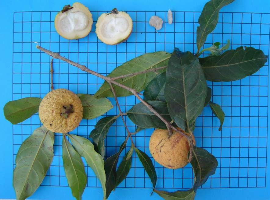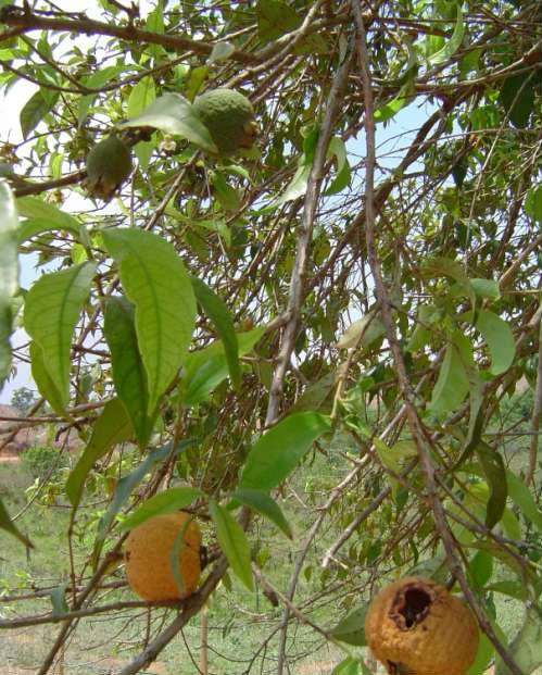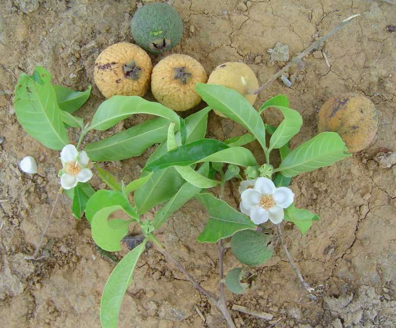 | Características: Árvore de pequeno a médio porte, 3 a 7 metros de altura. Folhas simples, 9 a 10 cm. Frutos com 4,5 cm, redondos, amarelos quando maduros, superficie rugosa, comestivel, sabor um pouco ácido. 6 a 8 sementes por fruto, envoltas em polpa branca. Germina facilmente, desenvolvimento normal. | ||