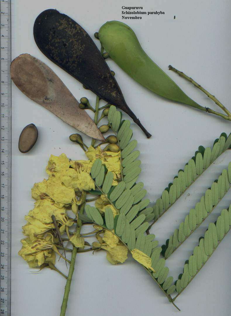 | Nome cientifico: Schizolobium parahyba | Família: Fabaceae Caesalpinioidae | Nomes populares: Guapuruvu, Ficheira, Tento |