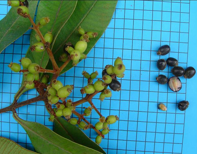 | Características: Árvore de médio porte, 12 a 18 metros, tronco reto e copa piramidal. Folhas simples, 15 cm, face superior lisa, face inferior com nervuras marcadas, de cor mais clara ou mesmo avermelhada. Floração branca em cachos. Frutos em cachos, redondos ou alongados, 1,5 cm, preto e macio quando maduro, com uma única semente de 1 cm envolta em polpa branca adocicada. Germinação fácil, desenvolvimento lento. | ||