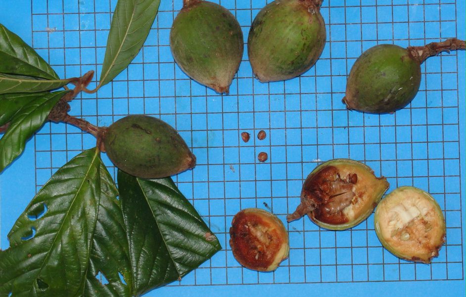 Características: Árvore de grande porte, 20 metros de altura. Folhas simples, 18 cm, lisa face superior e nervuras marcadas na inferior. Não a vi em flor. Fruto oblongado, 5 cm, tomentoso, de cor verde mesmo quando maduro, casca muito dura, massa adocicada porém firme, com muitas sementes pequenas (0,5 cm) em formato de disco. | ||