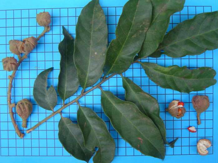 | Características: Árvore de médio porte, 15 a 20 metros de altura, geralmente bastante copada. Folhas compostas pinadas, 16 folíolos de 20 a 25 cm. Floração branca vistosa e perfumada. o fruto quando maduro de abre expondo 4 a 6 sementes cobertas por arilo vermelho que contrasta com o interior do fruto branco. Sementes de 1 cm, germinam bem. | ||