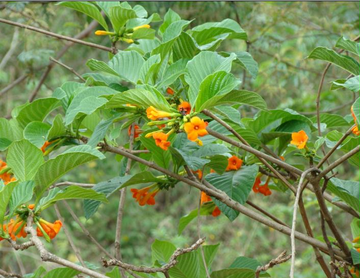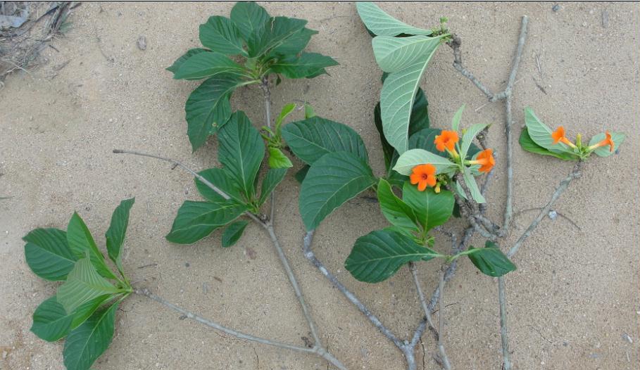 simples com nervuras marcadas. Flores alaranjadas, 6 a 7cm, muito bonitas.