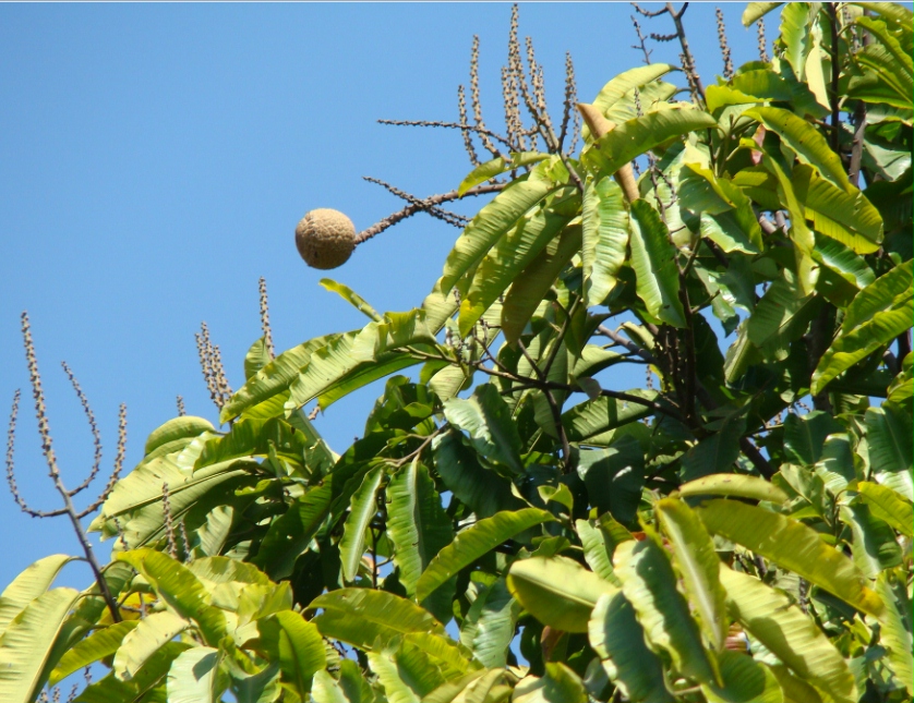| Características: Árvore de grande porte, este exemplar tem 13 metros de altura. Folhas largas e lisas, nervuras marcada, levemente avermelhadas quando novas. Flor grande, amarela quase branca. Fruto muito duro, redondo, 12 cm de diâmetro. quando quebrado expõe dezenas de sementes também envoltas por casca muito dura. A germinação é difícil e muito demorada. | ||