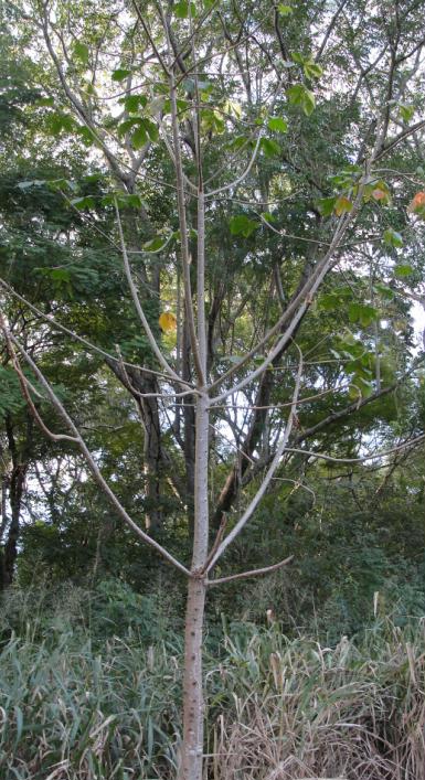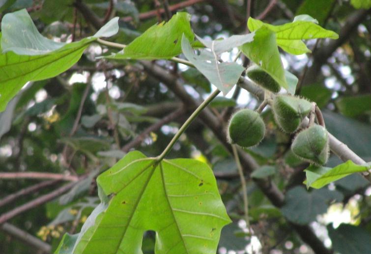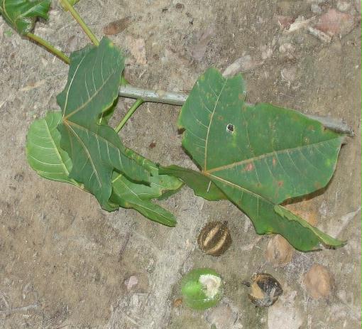 | Características: Árvore de médio porte, de 10 a 20 metros de altura. Como se pode ver nas duas primeiras fotos, em campo aberto fica mais baixa e arredondada, na mata fica mais alta e esguia. Folhas simples, lobadas e espinhentas, 20 a 25 cm, floração branca, pequena, em cacho, fruto arredondado com três lados, 7 cm. O fruto contem 3 sementes dificeis de retirar, pois é extremamente duro. Toda a planta, especialmente o fruto verde, tem espinhos agudos com uma substãncia extremamente urticante. Encostar na planta pode deixar o local dolorido por horas, e é perigoso para pessoas alérgicas. | ||