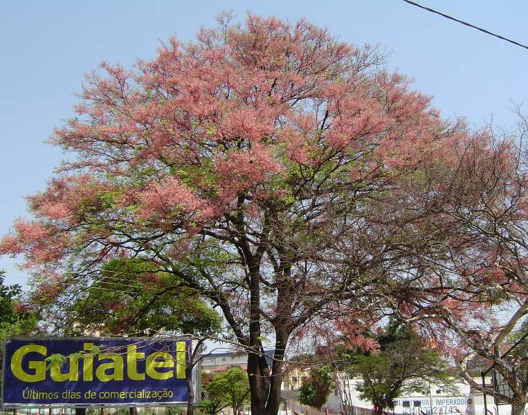 | Características: Árvore de médio a grande porte, 15 a 20 metros de altura, geralmente muito copada. Folhas pinadas, 20 folíolos de 5 cm. Floração rosa muito bonita. Fruto vagem cilíndrica 25 cm. Sementes duras marrom claro 2 cm. | ||