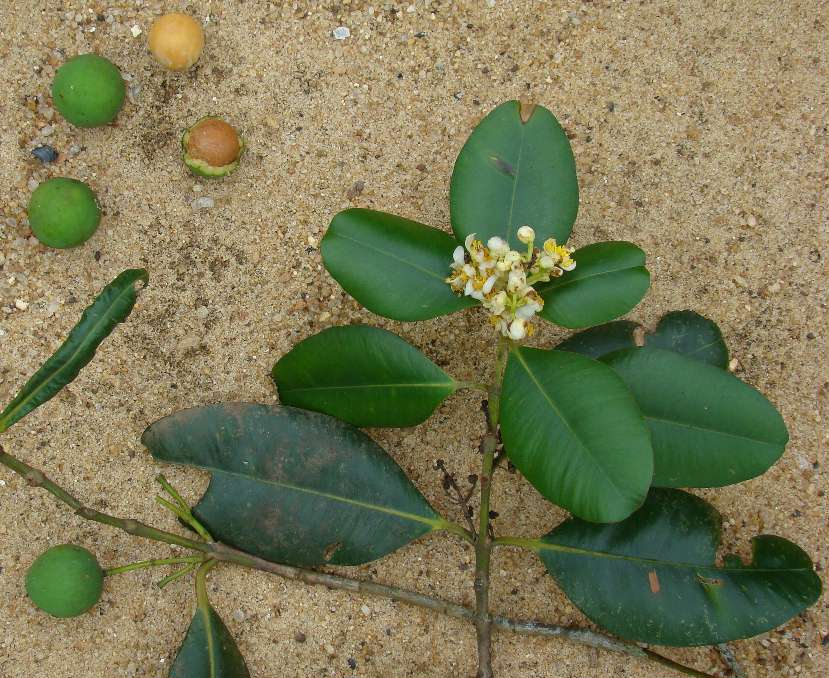| Características: Árvore de médio a grande porte, 20 a 30 metros de altura. Tronco com casca grossa,bem marcada. Folhas simples, lisas e duras, 12 cm. Flor branca, pequena. Fruto redondo, verde mesmo quando maduro, 2,5 cm. Uma única semente redonda e lisa de 2 cm, envolta por polpa dura procurada pela fauna. Germinação fácil, desenvolvimento rápido. | ||