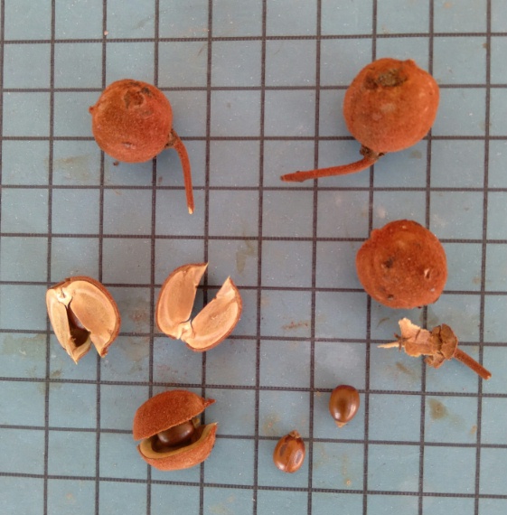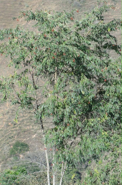 | Características: Árvore de pequeno a médio porte, 4 a 12 metros de altura, exuda latex. Galhos finos e pendentes, folhas simples e lisas, 12 cm. Flores muito pequenas. em cachos pendentes. Frutos pequenos ( 2 cm) redondos, tomentosos, que se abrem em 3 parte, com uma semente em cada parte. A abertura se dá com um estalo alto, e as partes são lançadas a uma boa distância. Sementes de 0,5 cm, cinza brilhantes. | ||