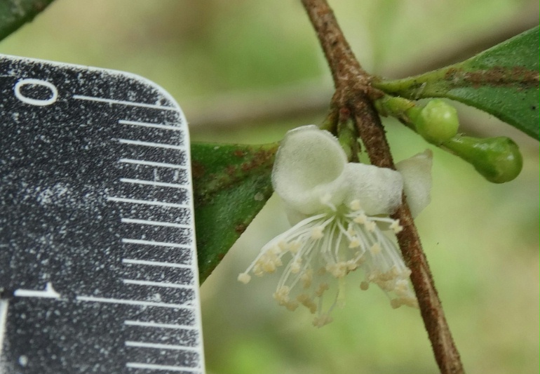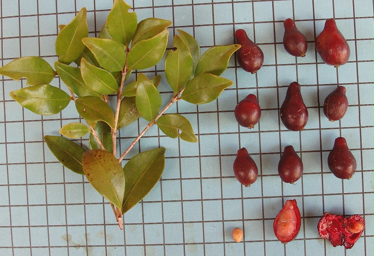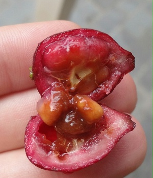 | Características: Árvore de pequeno a médio porte, 3 metros de altura. Folhas compostas pinadas, 4 a seis folíolos de 5 cm, lisos. As fotos de flores foram cedidas pelo amigo Fabio Longen. Fruto oval vermelho escuro a roxo, 5 cm, polpa vermelha acido adocicada, com 5 a 7 sementes de 0,5 cm. Trata-se de um Psidium, entretanto não dá para definir a espécie. Estou denominando de Psidium spp1 porque temos outro na página também indefinido, o Psidium spp2. Atualmente está em estudo e avaliação para descrição como nova espécie. | ||