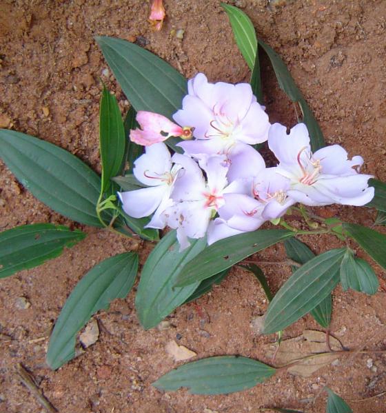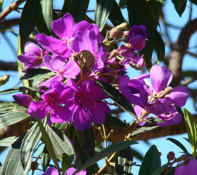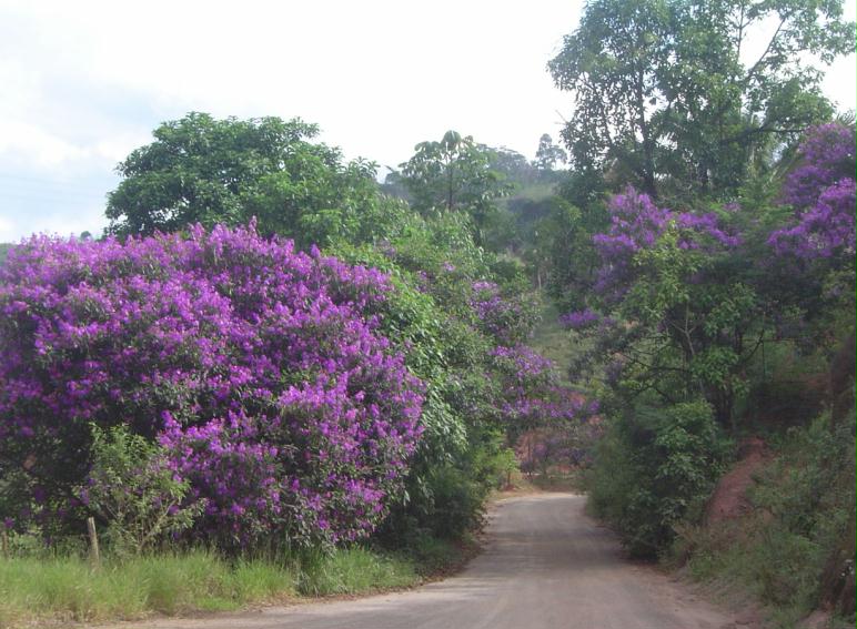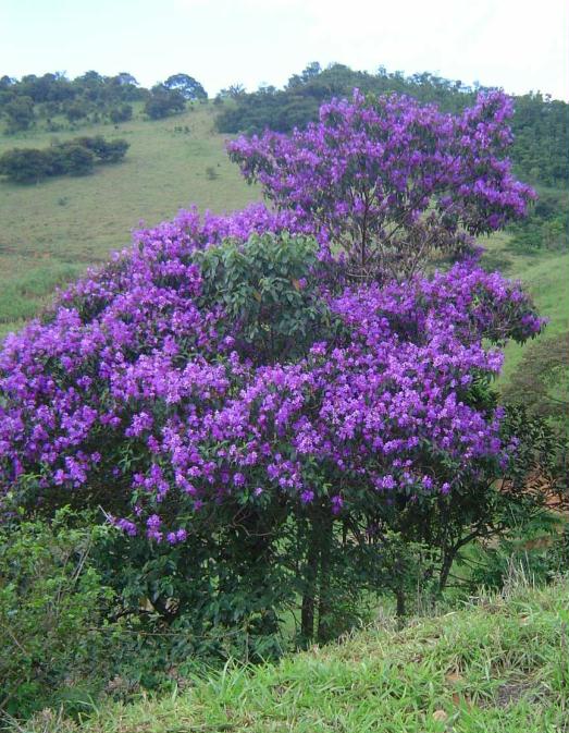 | Características: Árvore de médio porte, 7 a 12 metros de altura. Folhas simples, até 20 cm, ásperas, trinervadas. Flores roxas, em cachos, muito vistosas. Fruto cápsula em forma de cálice, 1 cm. abre a parte superior liberando muitas sementes minúsculas. Encontrada aqui na região, em matas de altitude e mais frias, uma outra espécie de Tibouchina de flores rosa e maior porte, que aparece nas duas últimas fotos. | ||