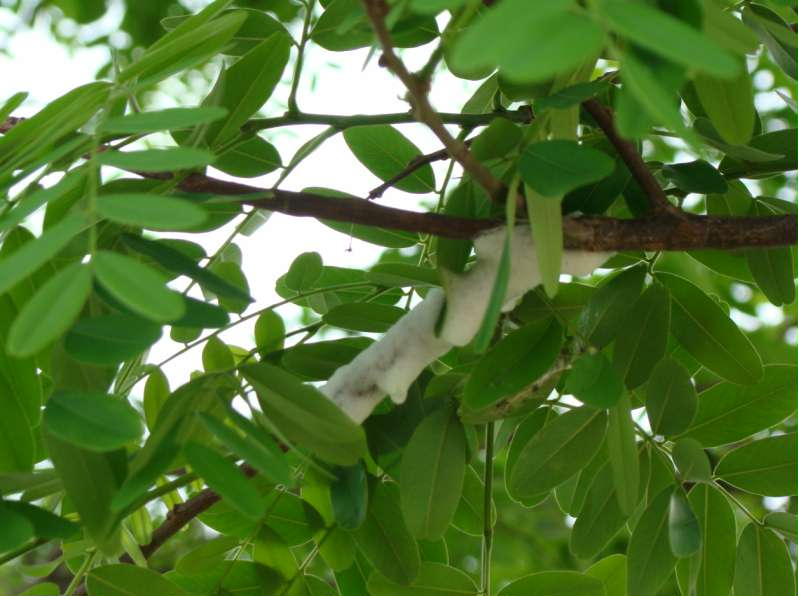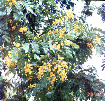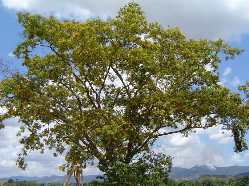 | Características: Árvore de médio a grande porte, de 12 a 24 metros de altura, em geral porte ereto, tronco costuma ter sulcos verticais profundos. Folhas compostas, paripinadas, com folíolos de 3 cm. Flores amarelas, pequenas.Fruto alado, 6 cm, marrom claro. Permanecem muito tempo na árvore, após maduros. Sementes 1,5 cm, difíceis de ser retirados do invólucro. Esta árvore, tem seu nome popular derivado de orvalho, pois acontece de gotejar de sua copa em períodos muito secos. Isto ocorre devido ao excremento de insetos como um tipo de cupim que faz seu ninho nesta espécie. Abaixo uma foto deste fenômeno. | ||