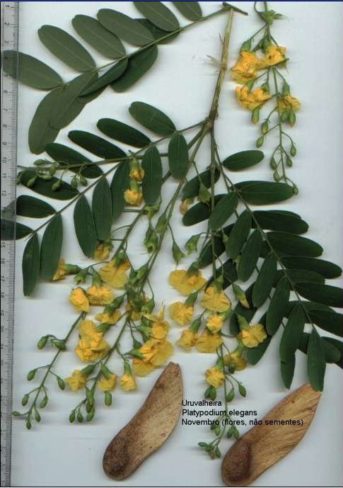 | Nome cientifico: Platypodium elegans | Família: Fabaceae Faboideae | Nomes populares: Uruvalheira, Amendoim do mato, Faveiro. |